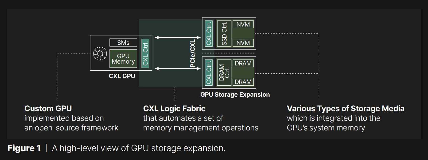 Architecture overview | To overcome the GPU memory capacity limitation with minimized performance drop, Panmnesia introduces GPU storage expansion technology based on compute express link (CXL). Refer to Figure 1 for a high-level overview of the GPU storage expansion approach this paper aims to facilitate. CXL employs the PCIe physical data link to map devices, known as endpoints (EPs), to a cacheable memory space accessible by the host. This setup allows compute units to access EPs directly through standard memory requests. Unlike the synchronous communication of DRAM interfaces defined by JEDEC’s DDR standard, CXL enables asynchronous communication with compute units, similar to block storage. This flexibility permits the implementation of EPs using various storage media, including non-volatile memory (NVM) based SSDs and DRAMs.