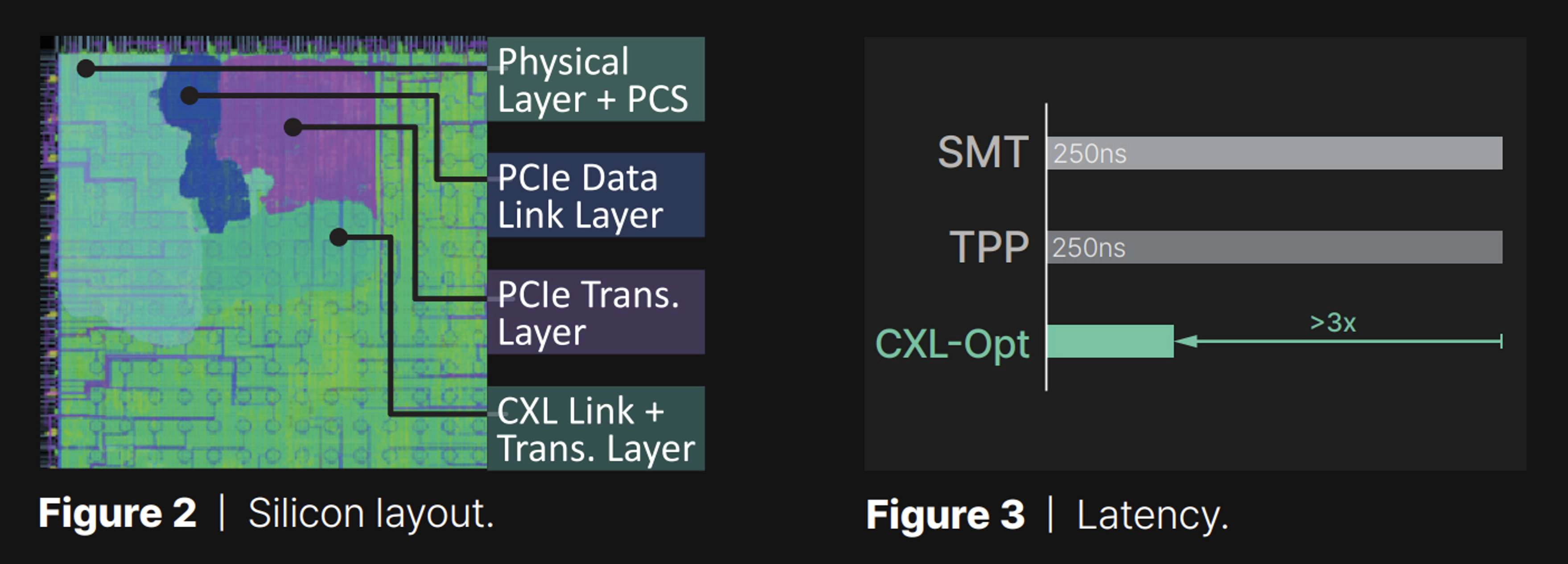 For better understanding, we compare the round-trip latency of our CXL controller (CXL-Opt) with that of SMT[5] and TPP[6]. The results are shown in Figure 3, demonstrating that our controller is more than 3× faster than SMT and TPP. Although there is no publicly available information about their silicon, we conjecture that they leverage PCIe architecture. In contrast, our controller is fully optimized for CXL, from the physical layer to the link layer, and the transaction layer.