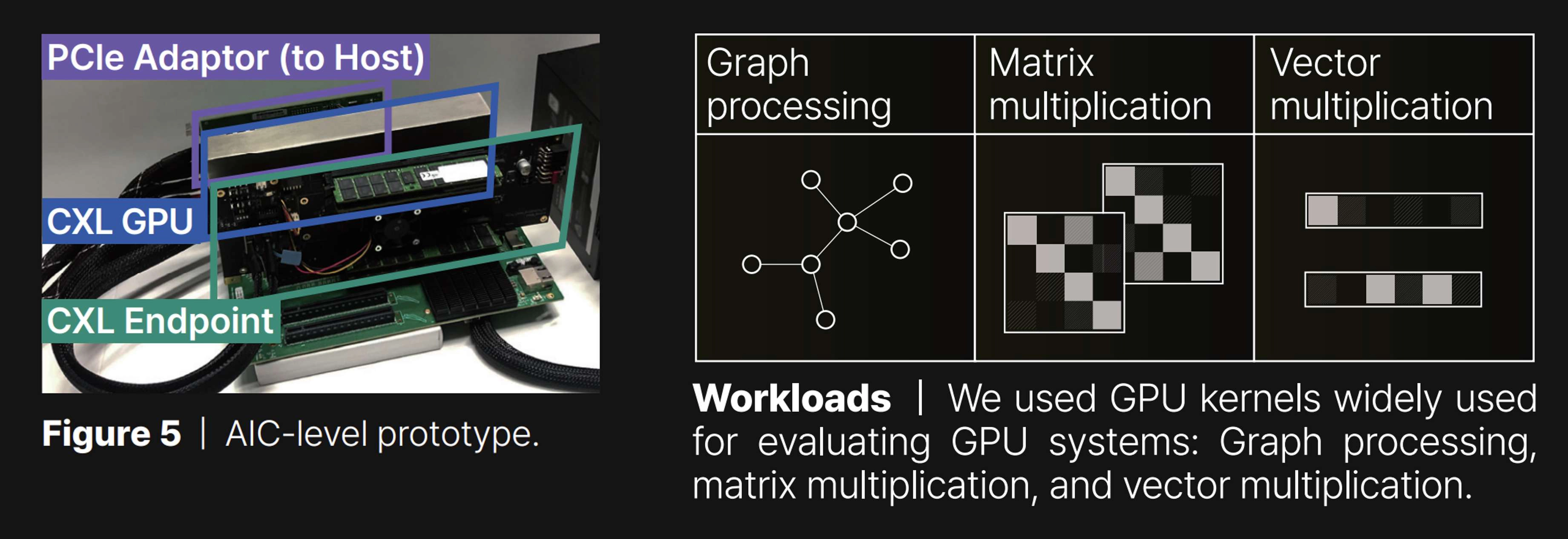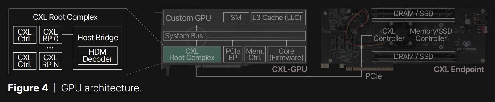 GPU architecture design and integration | In our approach to developing EP devices for GPU storage expansion, we have combined the functionalities of the CXL controller with those of memory/SSD controllers, as shown in Figure 4. This combination enables the CXL controller to extend its backend storage space to the host system, designated as host-managed device memory (HDM). However, integrating with the GPU architecture presents unique challenges due to the requirement for the EP to be recognized by the GPU’s cache system. A straightforward implementation, akin to that used for EPs, is not suitable in this context. To address these challenges, we have developed a specialized CXL root complex (CXL RC) featuring a host bridge equipped with multiple root ports (RP). This configuration is shown on the left side of the figure, where the host bridge connects to a system bus port on one side and several CXL root ports on the other. One of the key components of this setup is an HDM decoder, responsible for managing the address ranges of system memory, referred to as host physical address (HPA), for each root port. These root ports are designed to be flexible and capable of supporting either DRAM or SSD EPs via PCIe connections. Figure 4 also shows the placement of the CXL root complex within the architecture of our custom GPU, which has been developed based on an open-source framework. The systems that integrate our CXL controllers, including the custom GPU and EP, are realized on a 7 nm FPGA-based custom AIC, as depicted in Figure 5.