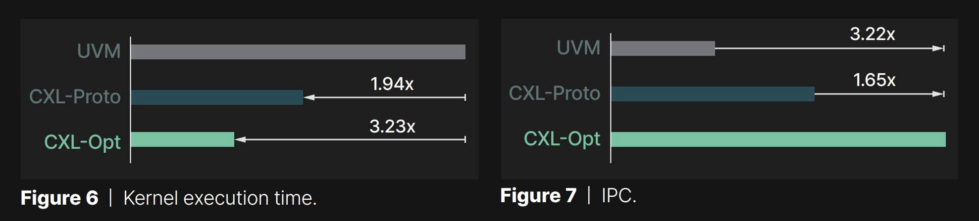 Performance analysis | Figure 6 compares the execution time of three different systems, and the values are normalized to that of UVM. As shown in the figure, UVM exhibited the worst performance across all GPU kernels we tested. This is because UVM suffers from host runtime intervention overhead when handling GPU page faults. In addition, since UVM migrates the data in the granularity of a page rather than a cacheline, the amount of data transfer is often larger than what the GPU kernel actually needs. In contrast, CXL allows GPU to access the expanded storage via load/store instruction, thereby eliminating the host runtime intervention and unnecessary data transfer issues. This makes CXL-Proto’s execution time 1.94× shorter than UVM. Panmnesia’s CXL-Opt further shortens the execution time by 1.66× by employing an optimized CXL controller exhibiting two-digit nanosecond round-trip latency and additional solutions to hide the read/write latency. This trend can also be observed in Figure 7, which shows the IPC values collected during GPU kernel execution. We can see that Panmnesia’s CXL-Opt shows 3.22x and 1.65x faster performance than UVM and CXL-Proto, respectively.